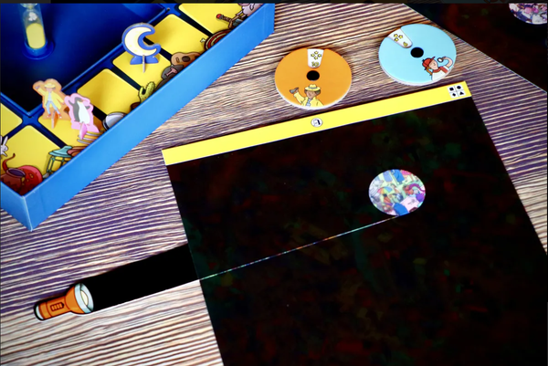 Spotlight mang đến một trải nghiệm thị giác cực kỳ độc đáo và kỳ ảo cho bàn tiệc. Thay vì nhìn trực diện vào tranh, người chơi sẽ sử dụng một chiếc đèn pin bằng giấy luồn vào giữa lớp bảng đen và tấm phim trong suốt để "soi sáng" các nhân vật đang lẩn trốn trong bóng tối.