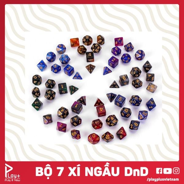 Bao gồm 7 viên xí ngầu: 20 mặt, 12 mặt, 2 cái cho 10 mặt, 8 mặt, 6 mặt, 4 mặt mỗi cái