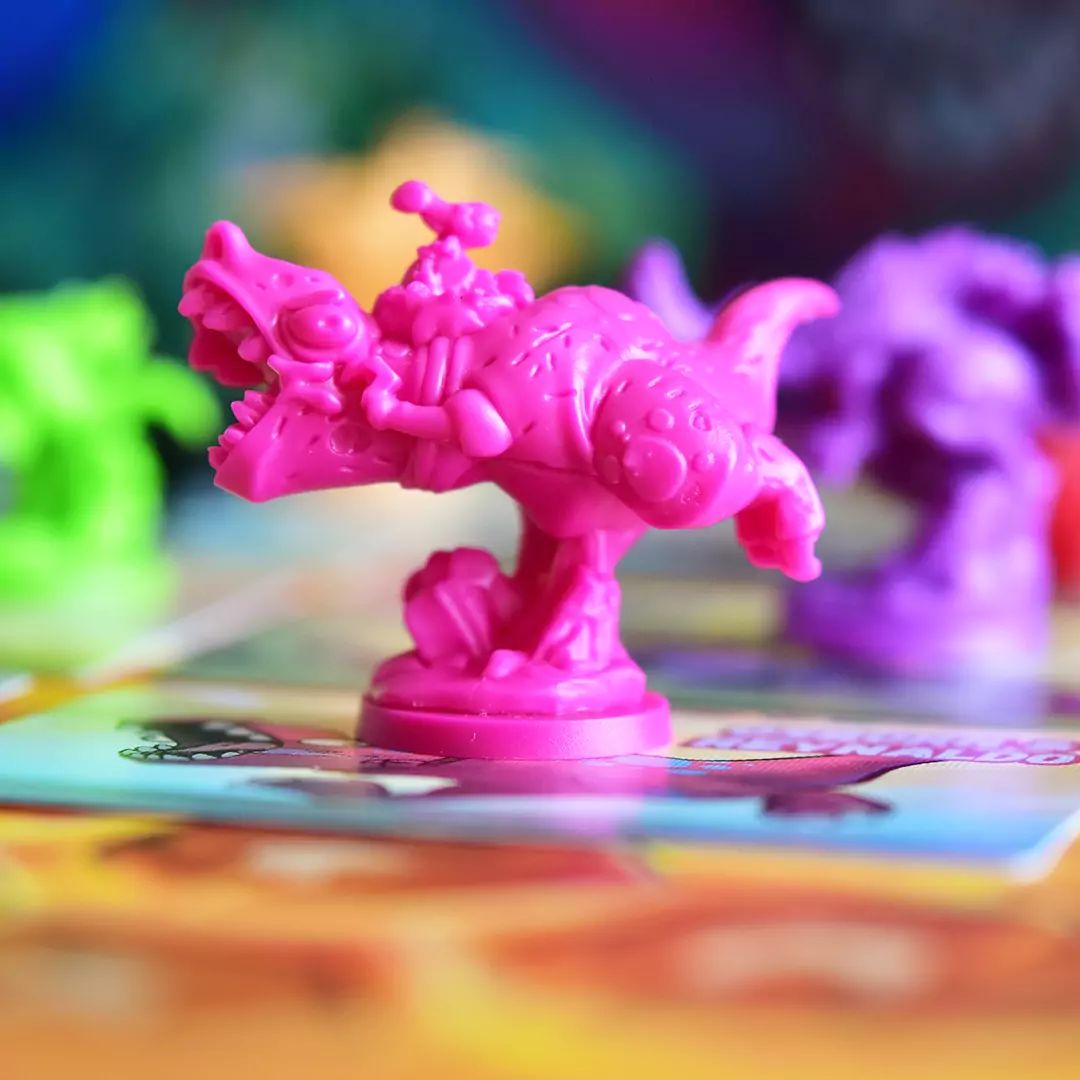 Choose your favorite Dodo/Dino miniature! Advance with blue or red cards and solve their whacky effects. Some will test your dexterity against your rivals by throwing bananas, flicking dodo eggs or making meteors fall. Red cards are extra powerful but if too many players pick them during the same round, their effects will be ignored. Green cards allow the Dodo to react at any time.
